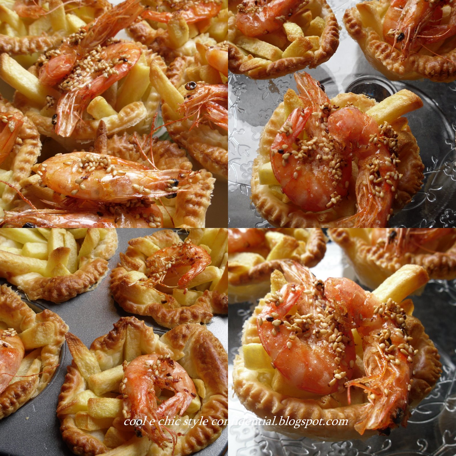 Ungete la teglia dei muffins, tagliate sei cerchi dalla pasta sfolgia, e metteti nella teglia a "cestino", distribuite le patatine stick ancora surgelate , saltate e mettete in forno a 220° per 10 minuti, controllate comunque la cottura. Nel frattempo sciaquate i gamberetti sotto l'acqua corrente asciugateli / tamponateli con carta da cucina , passateli nei semi di sesamo e tuffateli in un tegame di abbondate olio bollente, 2 munti e sono pronti, se perdono i semi raccolgieteli dal'olio scolandoli e rimetteteli sui gamberetti caldi, salate. Sfornate i cestini, e mettete su ognuno i gamberetti. Ecco !